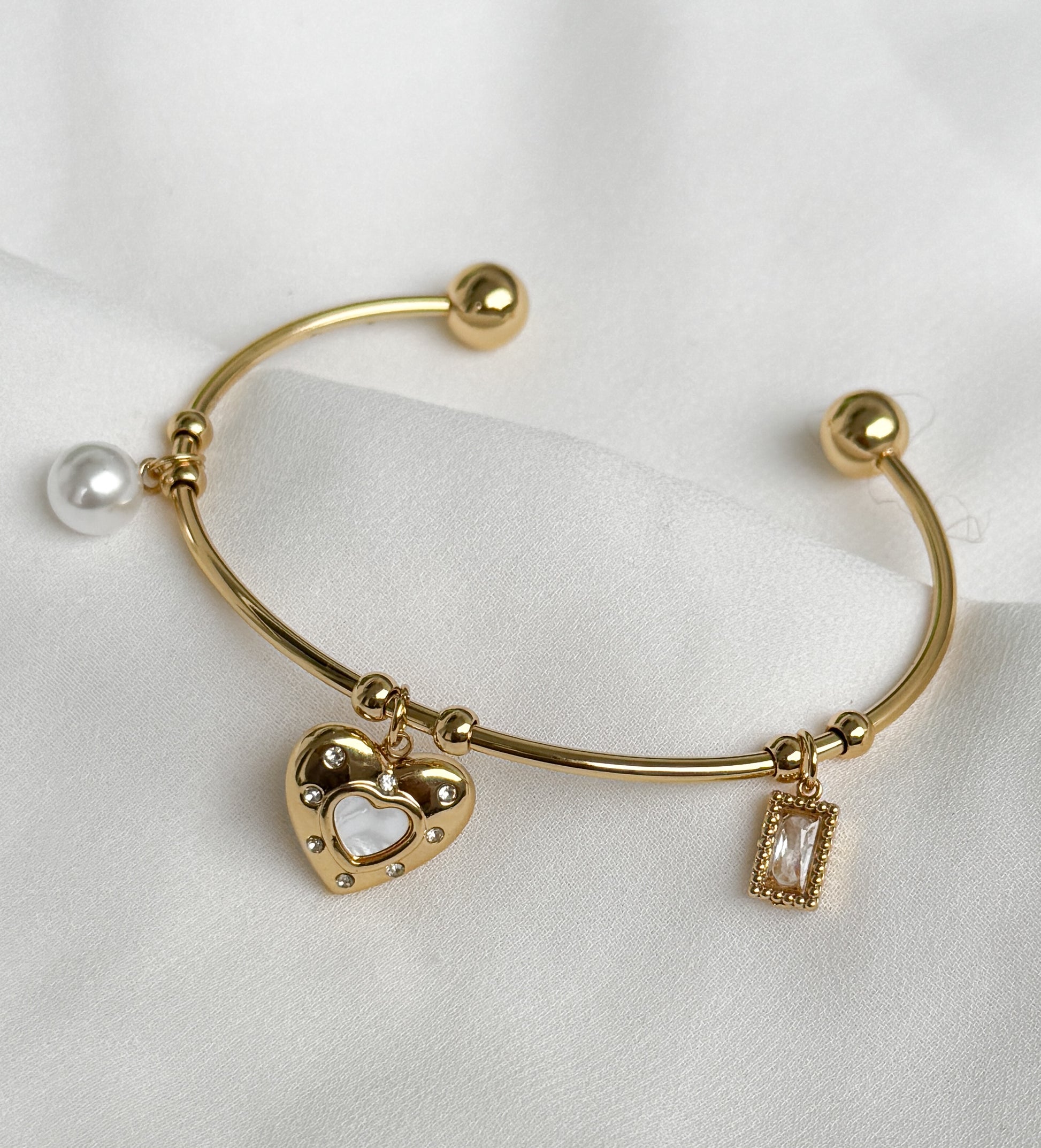 The Harmony Bangle is a delightful addition to your jewelry collection, featuring a sparkling heart, a zirconia charm and a pearl drop. Its playful design brings a cheerful sparkle to your style, making every moment effortlessly charming and fun.