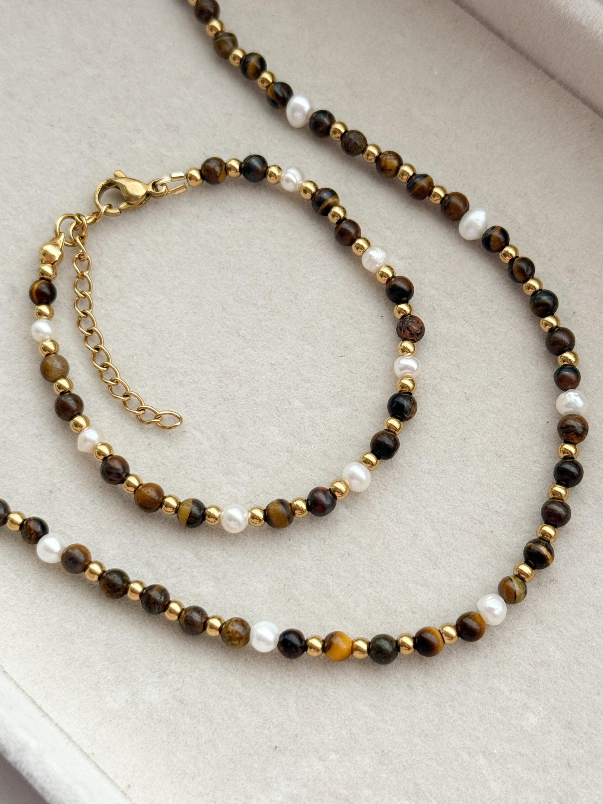 The Coffee Bracelet is a playful mix of smooth freshwater pearls and rich brown natural stones, sprinkled with shiny gold beads for a dash of sparkle. It’s the perfect fun accessory to brighten up any outfit with a touch of natural charm.