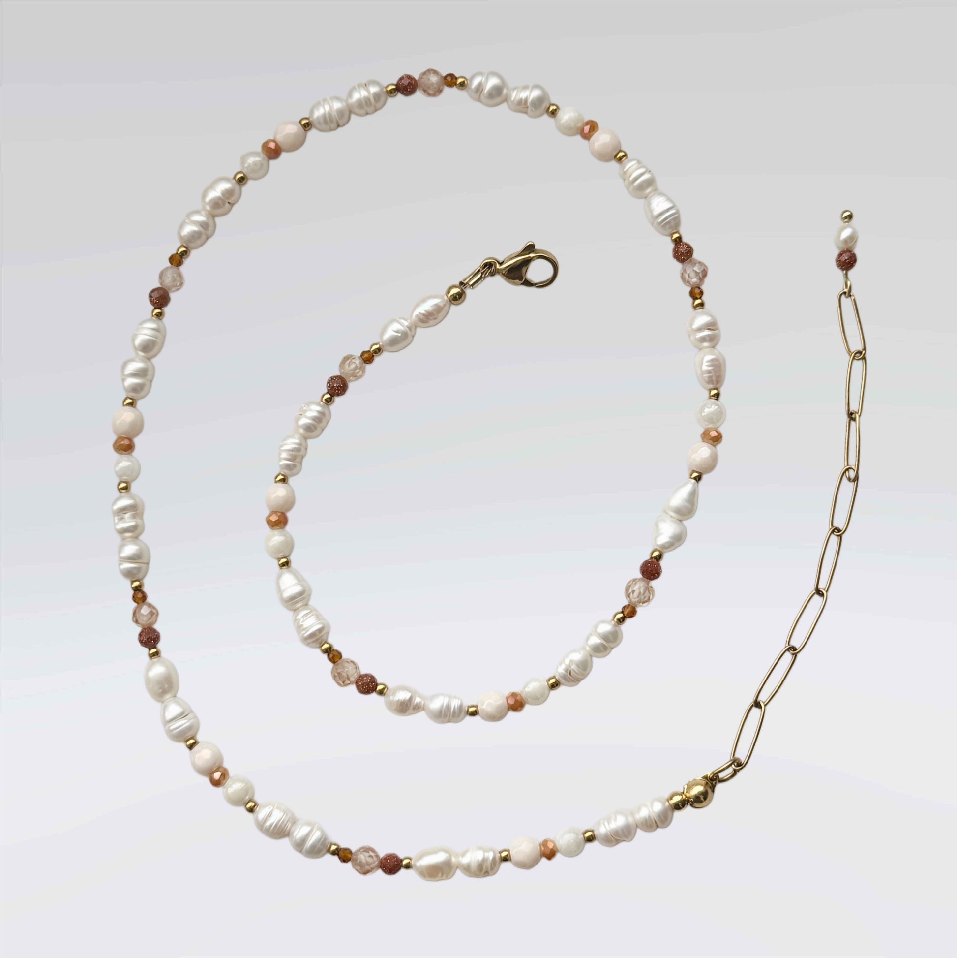 Brighten your day with the Honey Necklace—a playful mix of smooth freshwater pearls, colorful natural stones, and sparkling zirconia beads. This lively combination brings a touch of sparkle and fun to your neck, making every outfit shine with cheerful elegance.