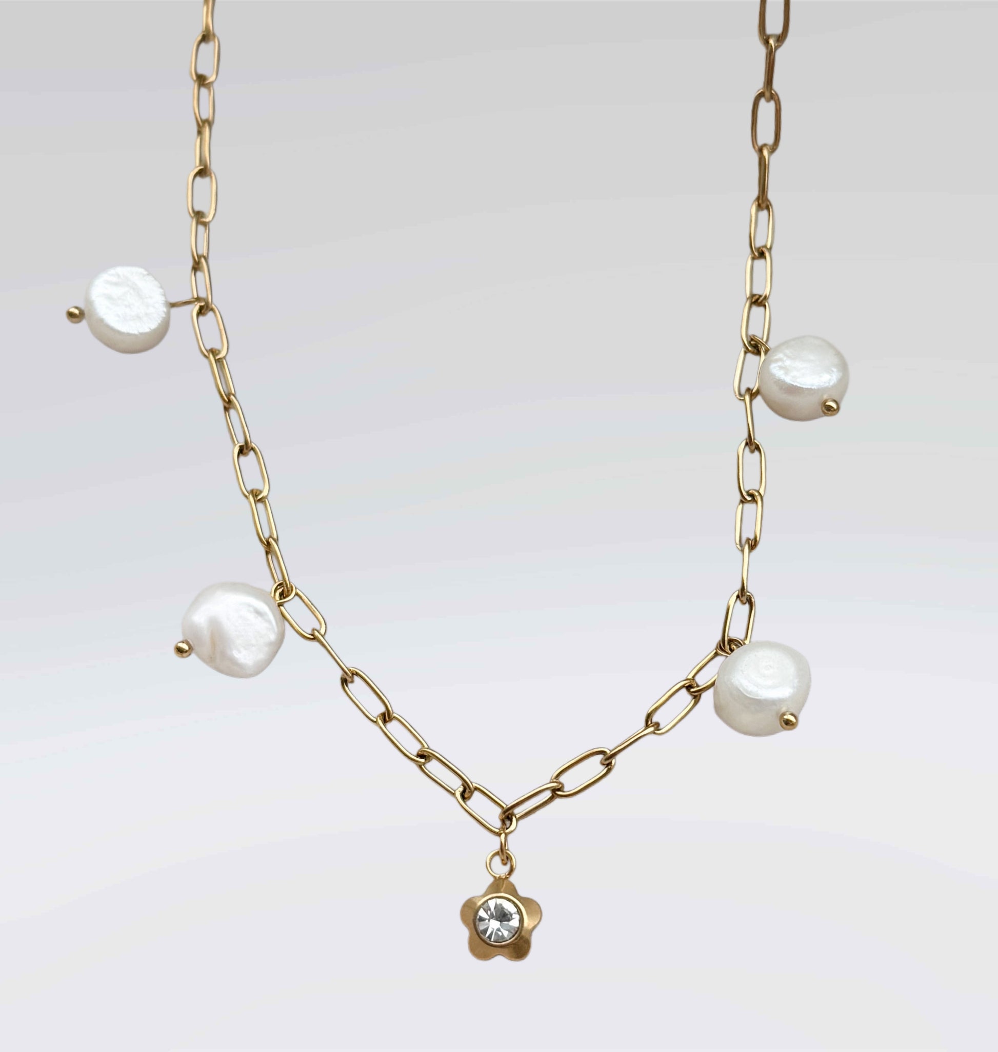 Get ready to embody spring vibes with our Perola Necklace. This playful and easy-to-wear necklace features four drop freshwater pearls and one zirconia flower in the middle. Perfect for adding a touch of quirky elegance to any outfit.